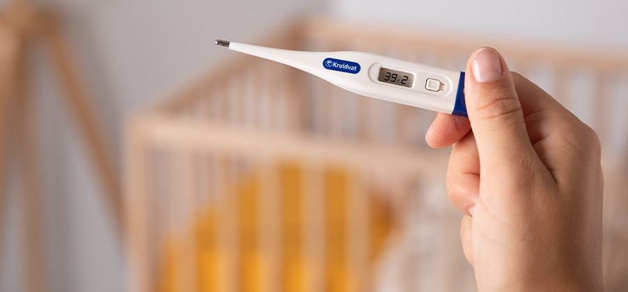 Vous avez l’impression que votre enfant a de la fièvre ? Prenez sa température. La voie de référence, c’est la voie rectale. Utilisez par exemple le Thermomètre à 60 Secondes Kruidvat. Couvrez le bout du thermomètre de vaseline pour rendre la prise de température plus douce et agréable pour votre bébé. Pour les enfants un peu plus âgés, vous pouvez aussi utiliser un thermomètre auriculaire, comme le Thermomètre Auriculaire Kruidvat, ou notre Thermomètre Auriculaire Numérique Infrarouge. Celui-ci existe également en version sans contact. Si la température corporelle atteint ou dépasse les 38 degrés, votre bébé a de la fièvre.