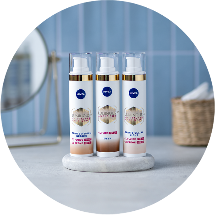 Le fluide CC pour le visage de NIVEA combine soin et couvrance naturelle en un seul produit. Le fluide CC réduit les taches pigmentaires dès deux semaines et les couvre immédiatement. Vous n’avez donc plus besoin de produits de soin séparés et d’un fond de teint bien couvrant. De plus, le Fluide CC 3-en-1 Luminous630 NIVEA est dotée d’une protection solaire FPS 30 pour protéger votre peau du soleil. Ainsi, vous prévenez l’apparition de nouvelles taches pigmentaires et leur assombrissement.
