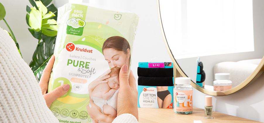 Les couches Pure & Soft Kruidvat sont fabriquées à base de matières douces d’origine naturelle. Grâce à leur grand pouvoir absorbant, elles tiennent la peau de bébé bien au sec, aussi bien de jour que de nuit. Les couches Pure & Soft Kruidvat répondent aux normes strictes de l’EU Ecolabel et la cellulose utilisée est certifiée FSC. De plus, elles représentent nos premières couches neutres en carbone, étant produites avec 100 % d’électricité renouvelable. 50 % des femmes et des hommes participant au panel ont indiqué qu’ils racheteraient sûrement ce produit. Leur principale raison était la coupe et le pouvoir d’absorption.