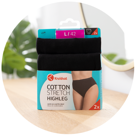 Le coton élastique doux des Culottes Cotton Stretch Highleg Kruidvat procure un grand confort. Les culottes sont échancrées au niveau des jambes, ce qui augemente encore le confort. L’entrejambe étant doublé de coton, la culotte est agréable à porter tout au long de la journée. La culotte échancrée est à 95 % en coton et à 5 % en élasthanne. Les consommateurs qui ont testé nos sous-vêtements étaient surtout très satisfaits de la coupe et du tissu des culottes. Plus de 35 % des femmes ont donné une note de 9 ou plus à nos culottes Cotton Stretch.