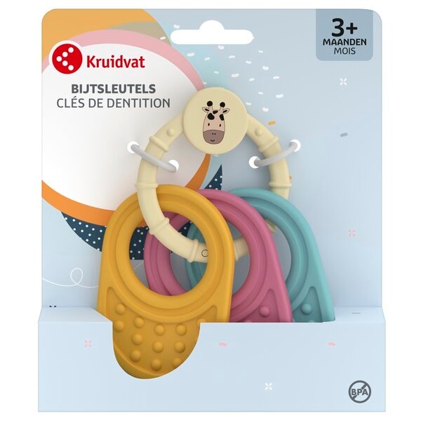 Les Clés de Dentition Kruidvat sont très attrayantes pour votre bébé grâce à leur forme reconnaissable et à leurs différentes textures. Elles sont idéales à mordiller et très faciles à tenir pour les petites mains.