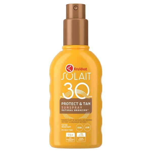 Le Sun Spray Protect & Tan FPS 30 High Kruidvat Solait contient de la vitamine E, a été testé sous contrôle dermatologique et résiste à l'eau.