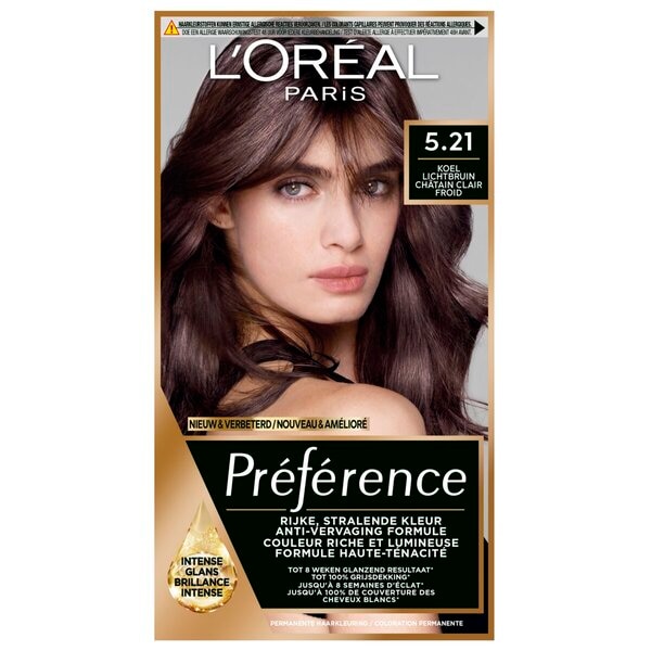Optez pour une couleur naturelle, brillante et éclatante, pleine de reflets, avec la Coloration Permanente 5.21 Châtain Clair Froid L'Oréal Paris Préférence.