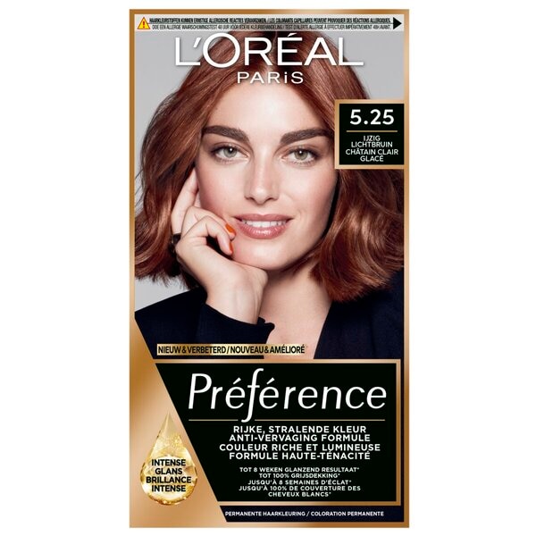 Optez pour une couleur naturelle, brillante et éclatante, pleine de reflets, avec la Coloration Permanente 5.25 Châtain Clair Glacé L'Oréal Paris Préférence.