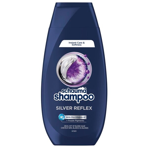 Neutralisez les reflets jaunes de vos cheveux blancs, blonds ou gris avec le Shampoing Reflex Silver Schauma Instant Care & Softness.