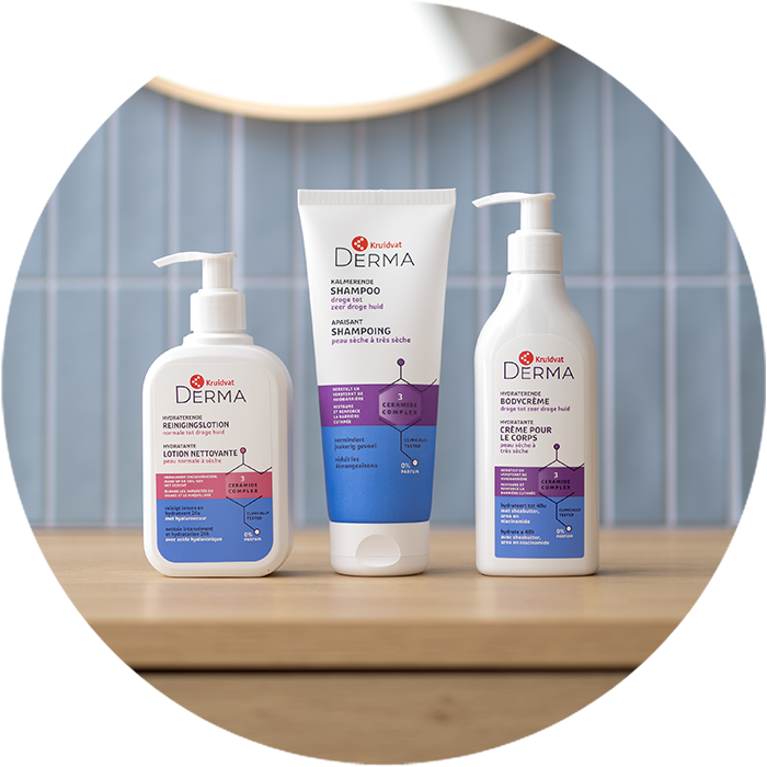 De Kruidvat Derma Hydraterende bodycrème met sheabutter, urea en niacinamide, hydrateert en verzacht je droge of gevoelige huid. Ook je hoofdhuid kan gevoelig zijn en snel irriteren. Daarom is er de Kruidvat Derma Kalmerende shampoo, die helpt bij het herstel, de bescherming en de versterking van je huidbarrière.