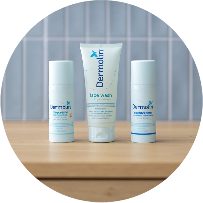 Dermolin is ontwikkeld voor de gevoelige of droge huid en bevat daarom geen parfum, zeep of kleurstoffen. Wél bevatten de producten speciaal verzachtende en verzorgende ingrediënten die je huid ondersteunen en helpen herstellen en zijn ze pH-huidneutraal en hypoallergeen. Gebruik de Dermolin facewash, de dagcrème en de nachtcrème en bescherm en hydrateer je huid.