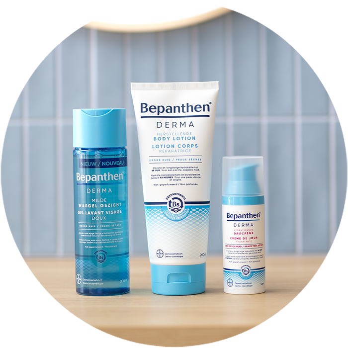 Heb je een droge huid? Was dan je gezicht met de Bepanthen Derma Milde Wasgel Gezicht, gebruik de Bepanthen Derma Hydraterende dagcrème en smeer je je lichaam in met de Bepanthen Derma Herstellende bodylotion. Deze producten helpen je huidbarrière te herstellen en een terugkerende droge huid te voorkomen.