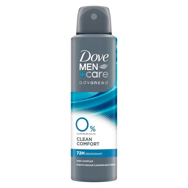 Dove Men+Care Advanced 0% Clean Comfort Deodorant Spray met anti-bacterieel zink-complex biedt tot 72 uur lang krachtige bescherming tegen zweet en nare geurtjes.