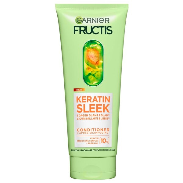 Maak je gladmakende routine compleet met de Garnier Fructis Keratin Sleek Conditioner. Hij ontwart en transformeert pluizig en droog haar.
