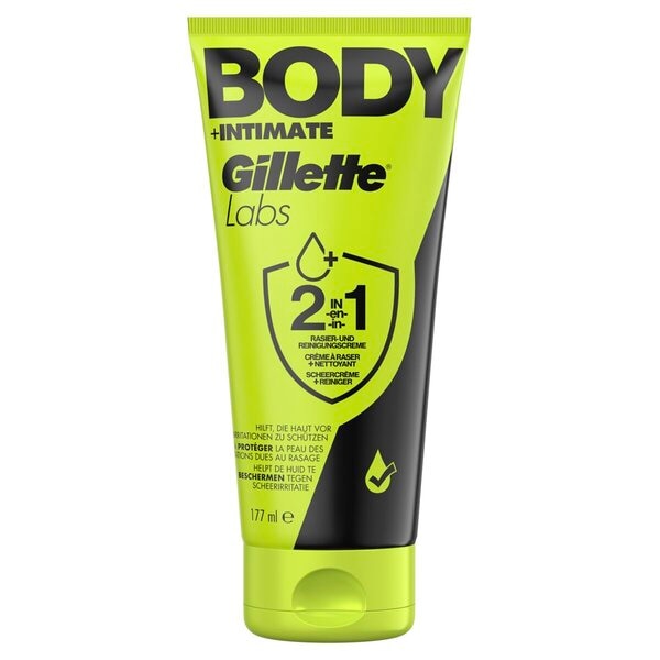 Bescherm, kalmeer en reinig met GilletteLabs Body + Intimate 2-in-1 lichaamsscheercrème voor mannen, een essentiële toevoeging aan je lichaamsverzorgingsroutine.