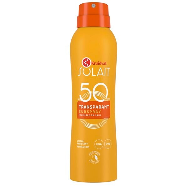 De spray geeft een continue en gelijkmatige nevel en is gemakkelijk in alle posities te verstuiven. Kruidvat Solait Transparant SPF50 Refreshing Sunspray is dermatologisch getest en wateresistent.
