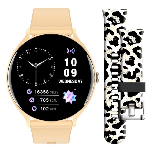 Deze True Spirit Smartwatch combineert stijl en gemak. De smartwatch komt met twee siliconen banden: een beige band en een band met panterprint. Het horloge heeft een technische kunststof kast een een handig full-touchscreen.