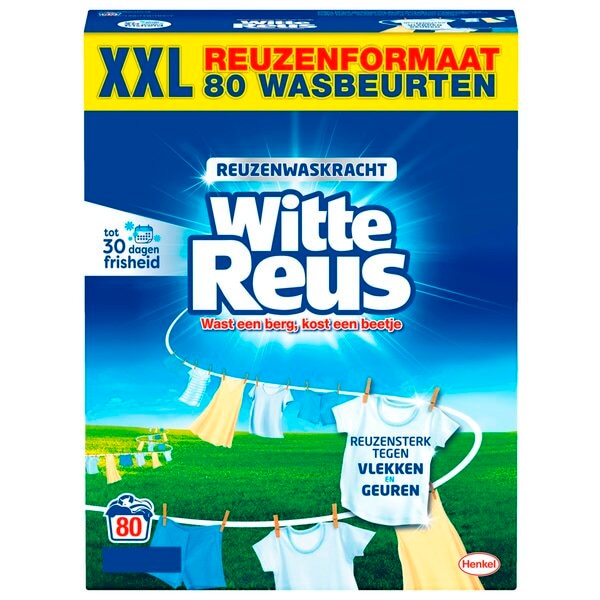 Witte Reus Waspoeder is een krachtig wasmiddel voor de witte was met reuzenwaskracht.